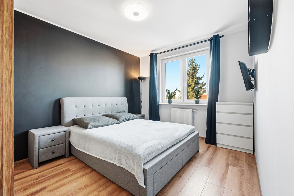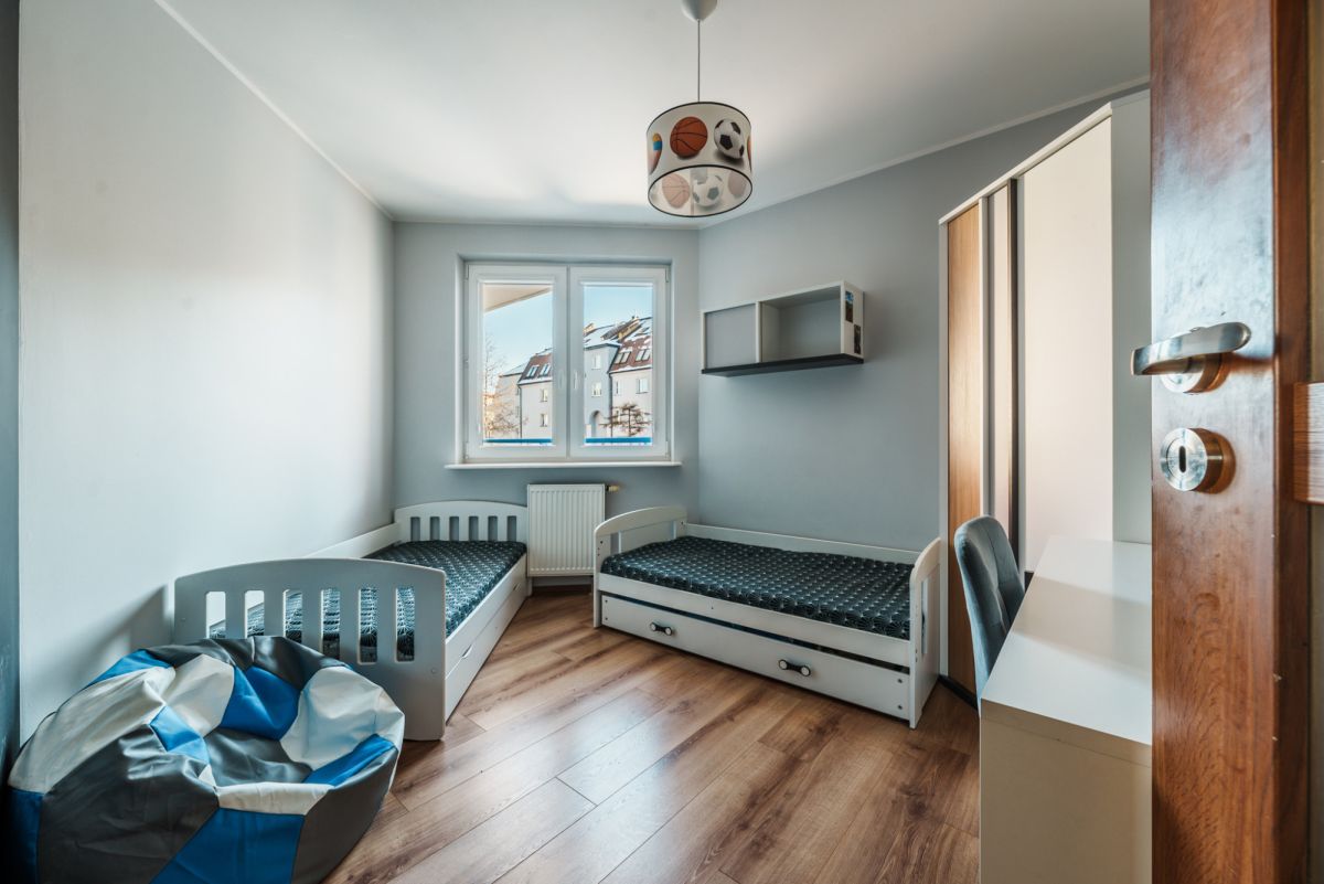 Na powierzchni 62,6 m² znajdują się: salon z aneksem kuchennym, dwie sypialnie, duża łazienka z prysznicem, hall.
